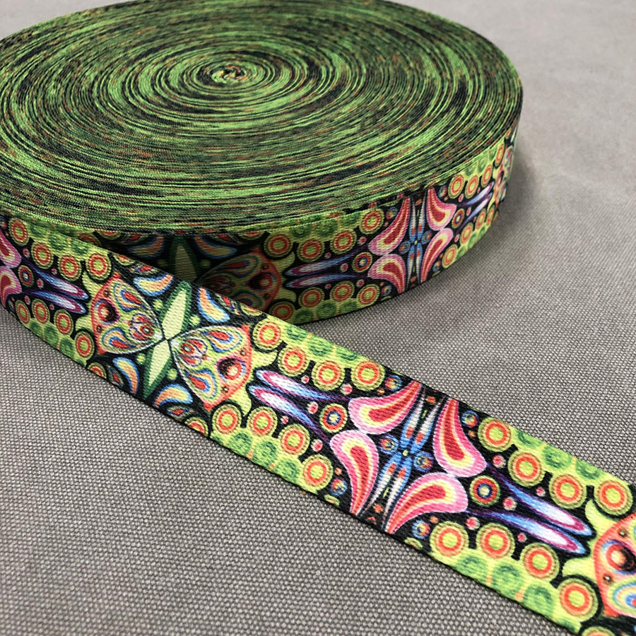 Стропа (ременная лента) плотная из синтетических волокон - с ярким фрактальным орнаментом с преобладанием зеленых оттенков в разнообразной цветовой гамме подойдет для различных галантерейных изделий. Лента двусторонняя - на правой и левой стороне рисунок как лицевой