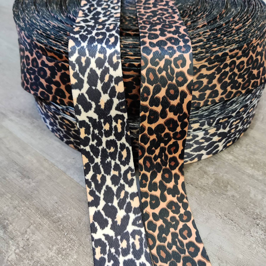 Стропа (ременная лента) средней плотности из синтетических волокон. Оригинальное цветовое сочетание текстильной стропы с ярким принтом под леопарда украсит ваше изделие.