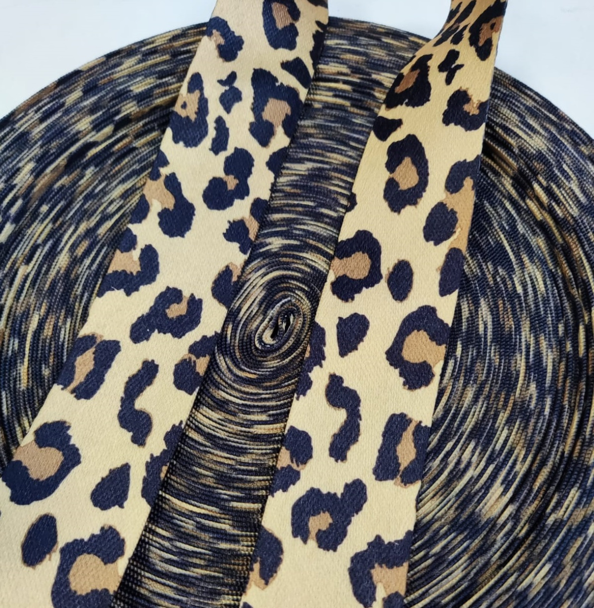 Стропа (ременная лента) плотная из синтетических волокон. Оригинальное цветовое сочетание текстильной стропы с ярким принтом под леопард (ягуар) украсит ваше изделие.