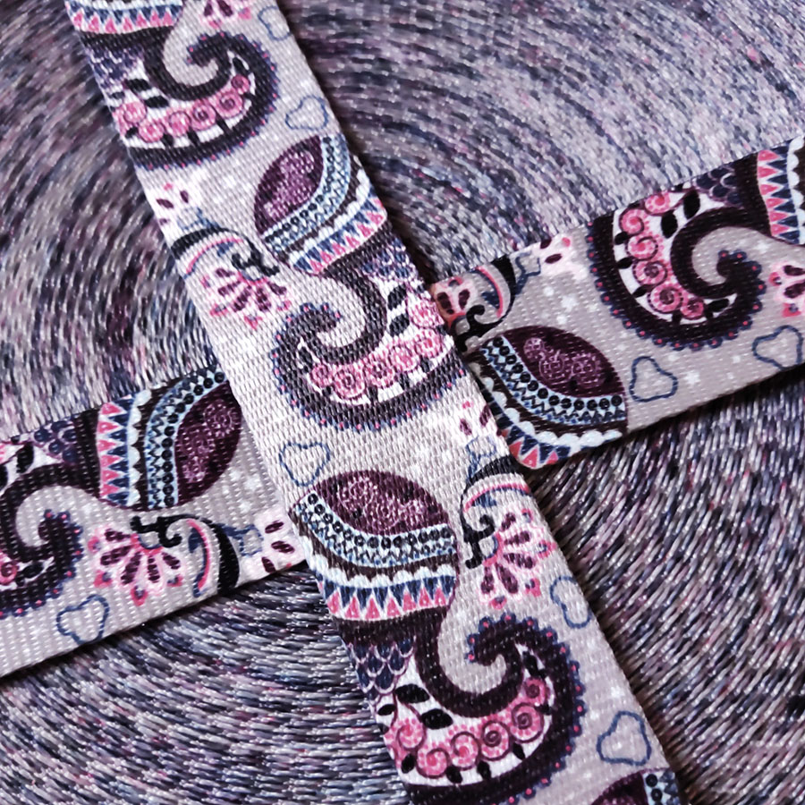 Стропа (ременная лента) средней плотности из синтетических волокон - с традиционным восточным рисунком пейсли (огурцы), в бежево-бордовой гамме. Оригинальное цветовое сочетание текстильной стропы с ярким принтом украсит ваше изделие.