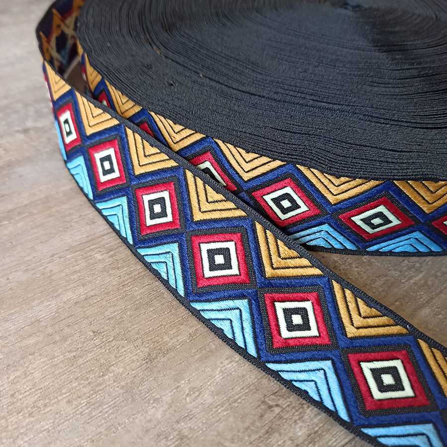 Плотная текстильная лента из синтетических волокон c вышитым орнаментом. Оригинальное цветовое сочетание в этническом стиле ленты украсит ваше изделие.