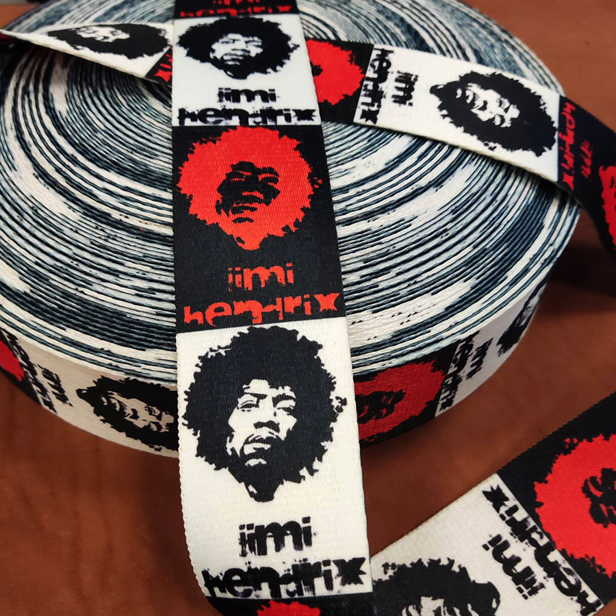 Широкая плотная стропа текстильная (ременная лента) из синтетических волокон. На ременной тесьме принт с изображением легендарного гитариста Джимии Хендрикса. Такая стропа идеально подойдет на изготовление гитарных ремней для музыкальных фанатов