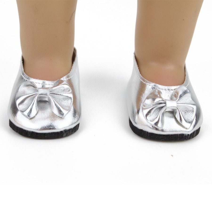 Миниатюрные балетки из блестящей серебряной экокожи, с бантом.
