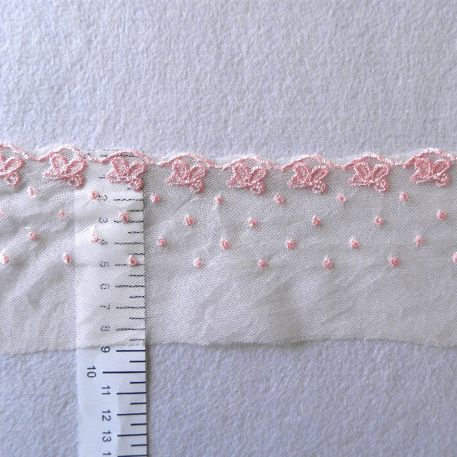 Розовое шитье на сетке, изысканный нежный вышитый на мягком сетчатом материале рисунок. Декоративная кружевная тесьма подходит для самых разных видов рукоделия - при пошиве одежды, для декорирования в скрапбукинге, в куклоделии и т.д.