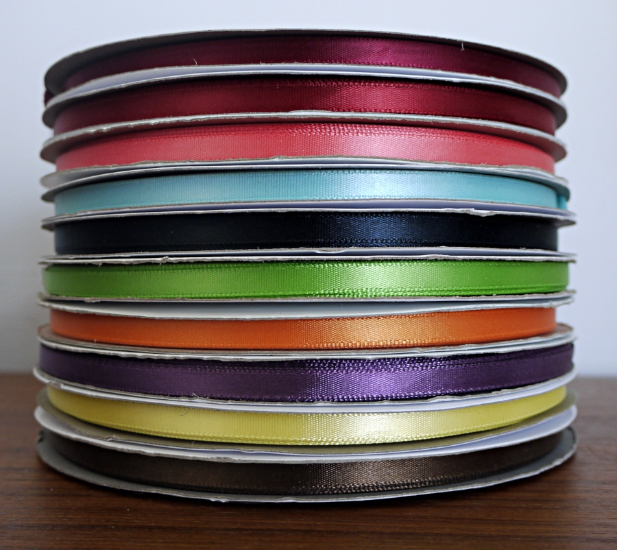 Атласные ленточки для творчества разных цветов шириной около 7 мм