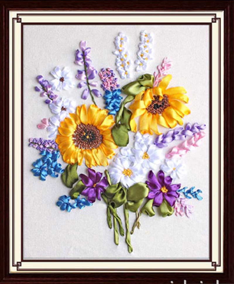 Готовый набор для рукоделия в технике вышивки атласными лентами.
