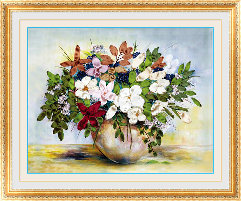 Ленты в наборе атласные, как правило имеют лицевую и изнаночную сторону (узкие ленточки иногда бывают двусторонние). В отличие от материалов из натурального шелка, атласные ленты не сминаются, хорошо держат объем и более подходят для вышивки крупных цветов, что особенно эффектно смотрится на полотнах больших размеров. А атласность ленты создает особую глубину светотени.