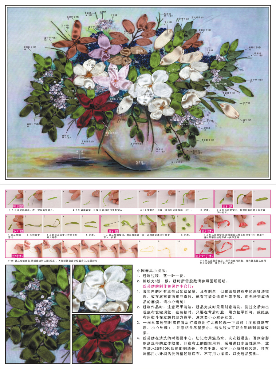 В набор входит плотная ткань с принтом, органайзер с атласными лентами, мулине х/б, игла для ленточек и игла для мулине, инструкция с иллюстрациями на китайском языке.