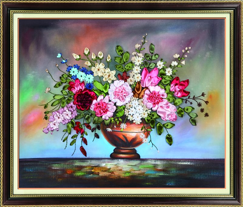 Ленты в наборе атласные, как правило имеют лицевую и изнаночную сторону (узкие ленточки иногда бывают двусторонние). В отличие от материалов из натурального шелка, атласные ленты не сминаются, хорошо держат объем и более подходят для вышивки крупных цветов, что особенно эффектно смотрится на полотнах больших размеров. А атласность ленты создает особую глубину светотени.