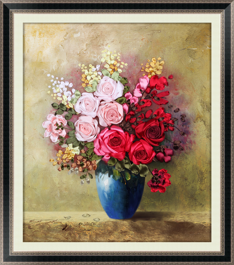 Набор для вышивки атласными лентами Розы в синей вазе Размер 50*50 см