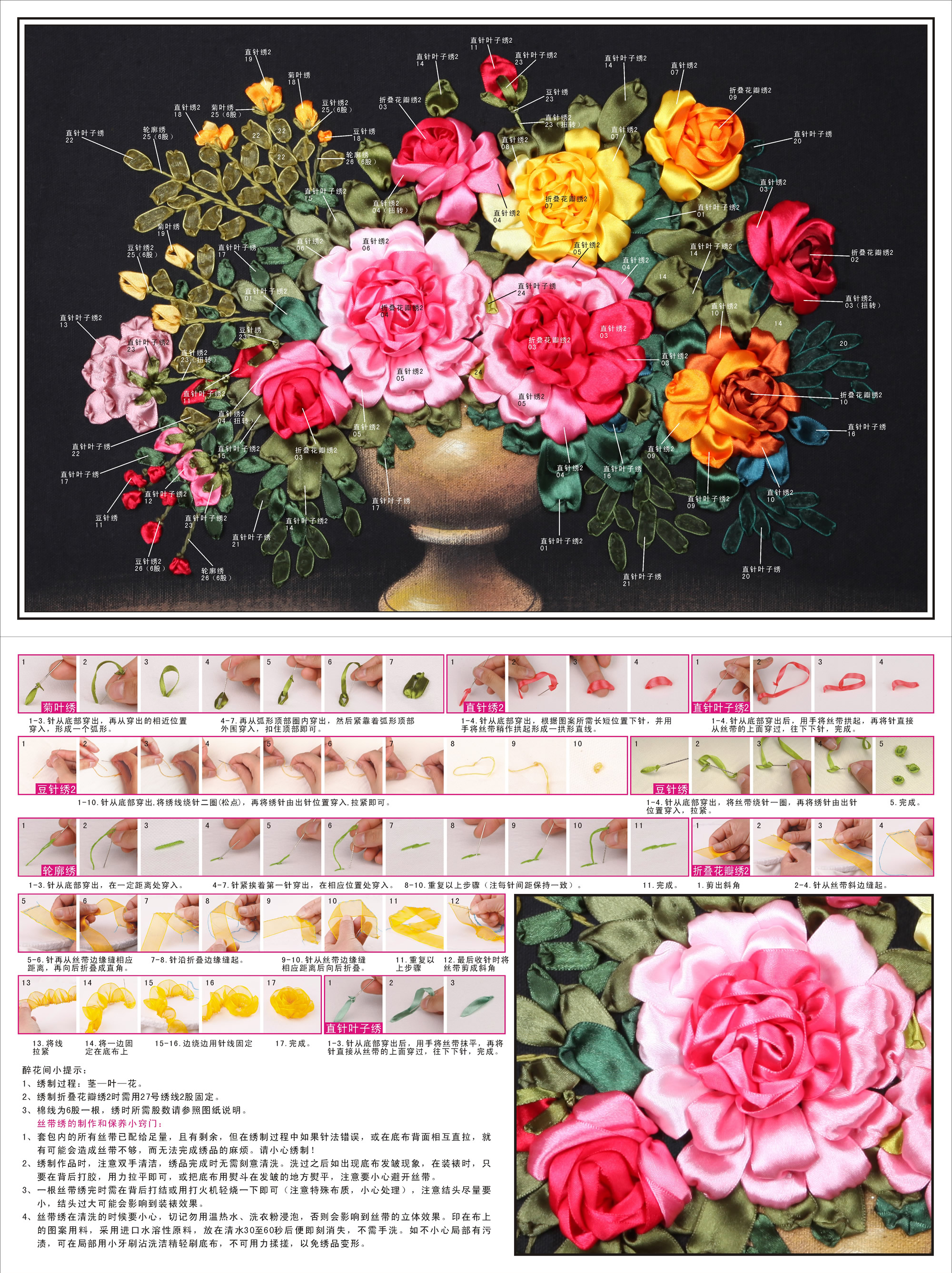 В набор входит плотная ткань с принтом, органайзер с атласными лентами, мулине х/б, игла для ленточек и игла для мулине, инструкция с иллюстрациями на китайском языке.