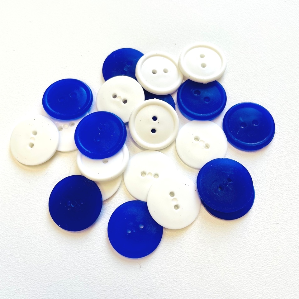 Пластиковые пуговицы диаметром 20 мм, представлены в двух цветах - синем и белом