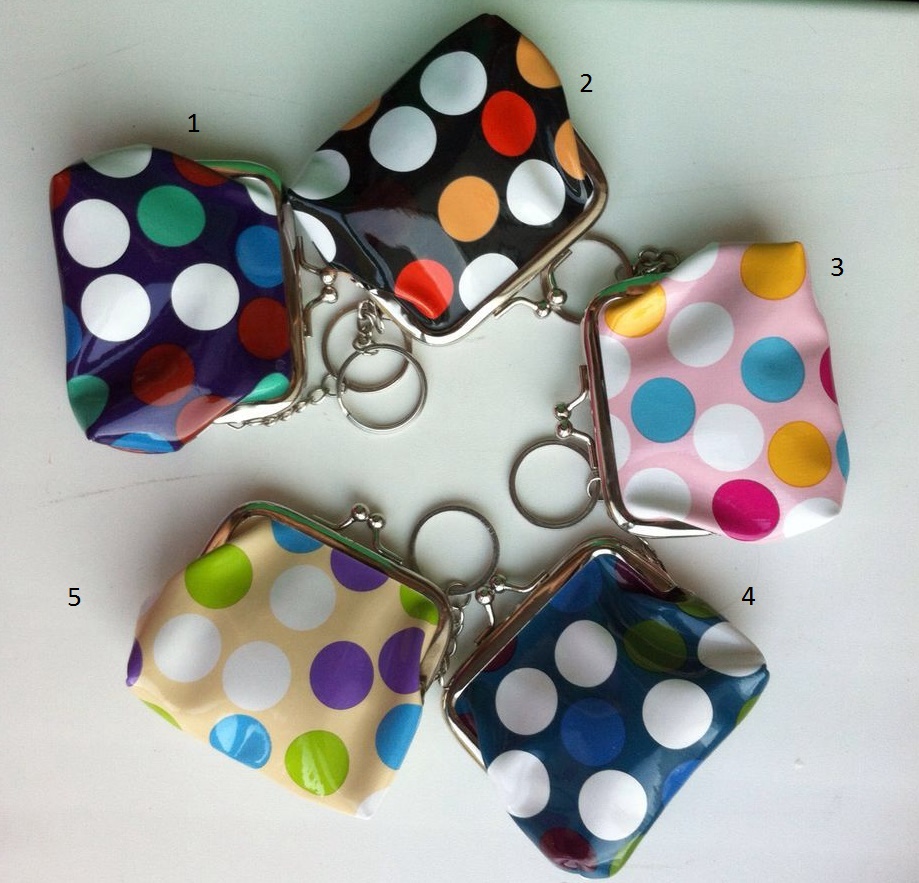 Аксессуары для куклы - очень симпатичные яркие сумочки в "горошек" лаковые, c фермуаром, на цепочке.