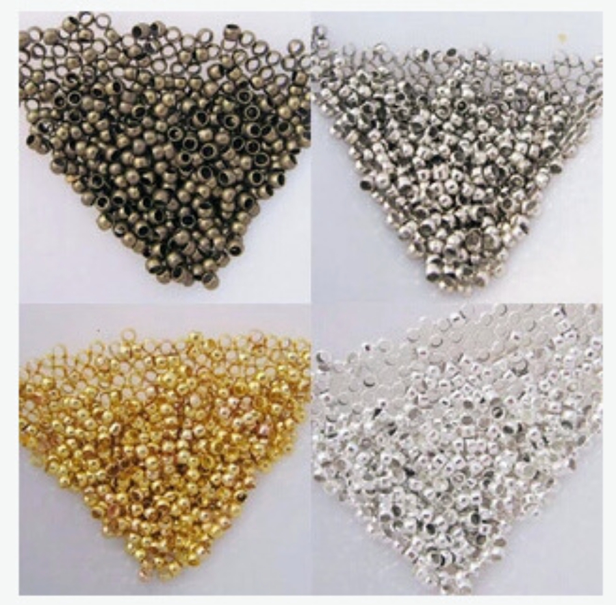 Используются для закрепления концов ювелирного тросика и при фиксации бусин «с промежутками». При сборке кримпы расплющиваются (зажимаются) кримпером или плоскогубцами для фиксации в определенном месте ювелирного тросика