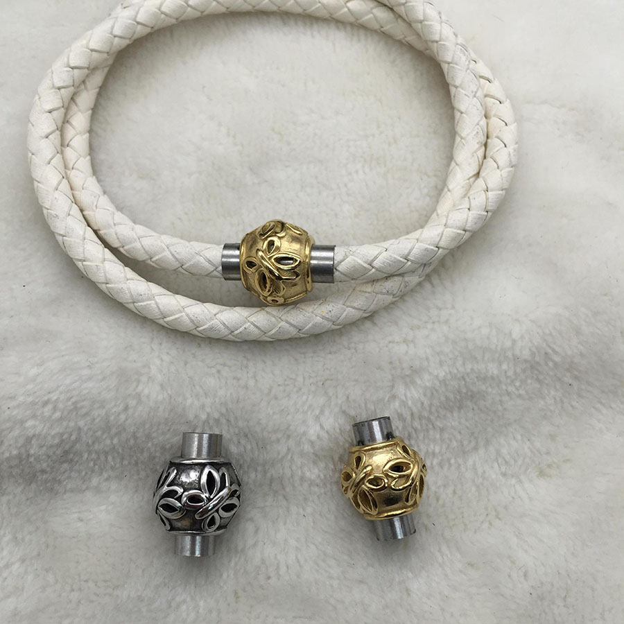 Концевик магнитны из нержавеющей стали для кожаных шнуров круглого сечения диаметром около 5 мм.