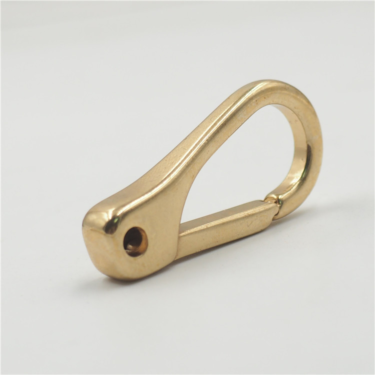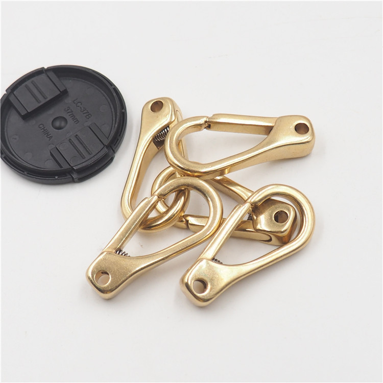 Карабин латунный под крепление при помощи кольца. Широко применяется при изготовлении сумок, рюкзаков, в верхней одежде и декоративных украшениях