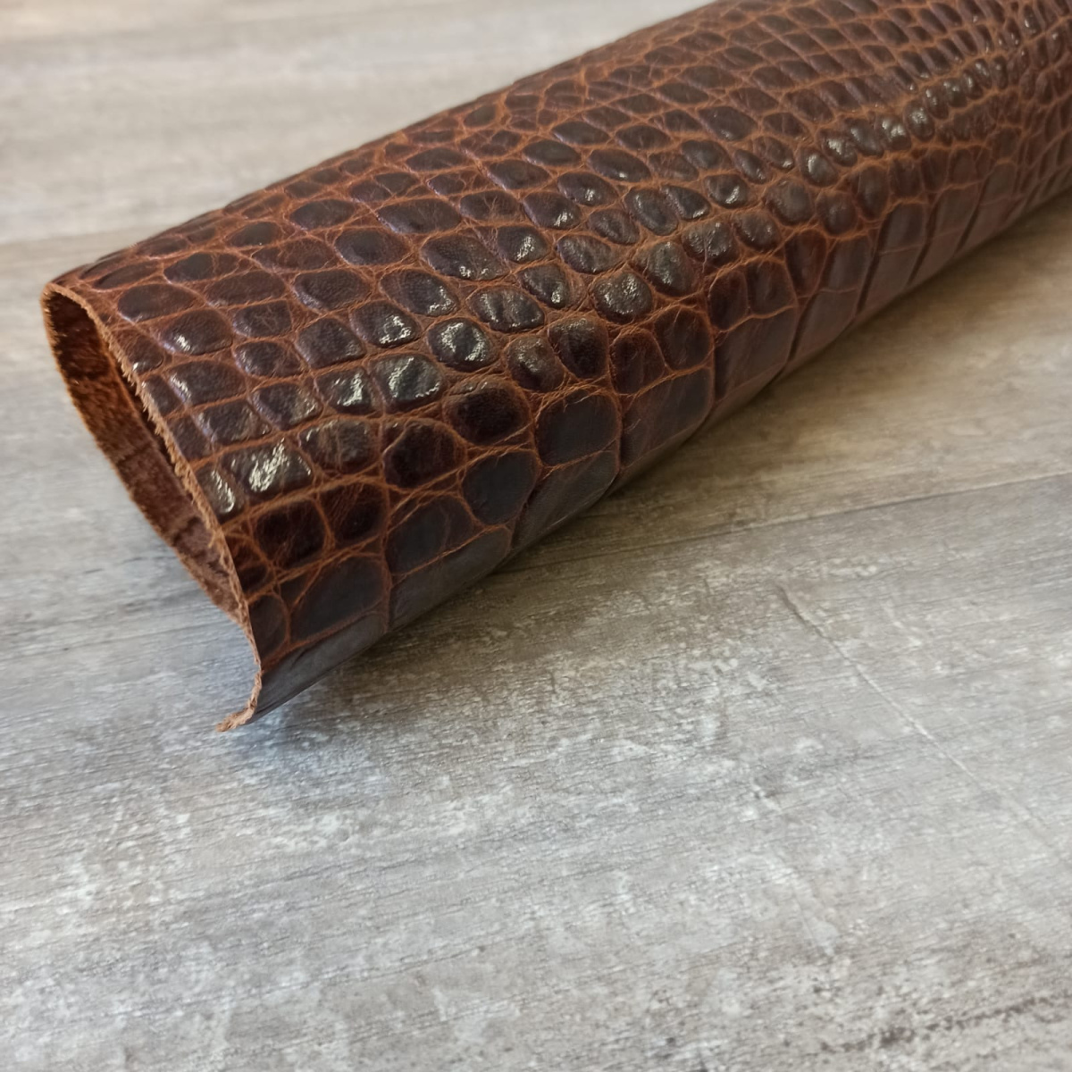 Кожа КРС хромового дубления с тиснением плитой под каймана. Кожа тонкая, плотная. Лицо гладкое, матовое, оригинальный цвет и узор.