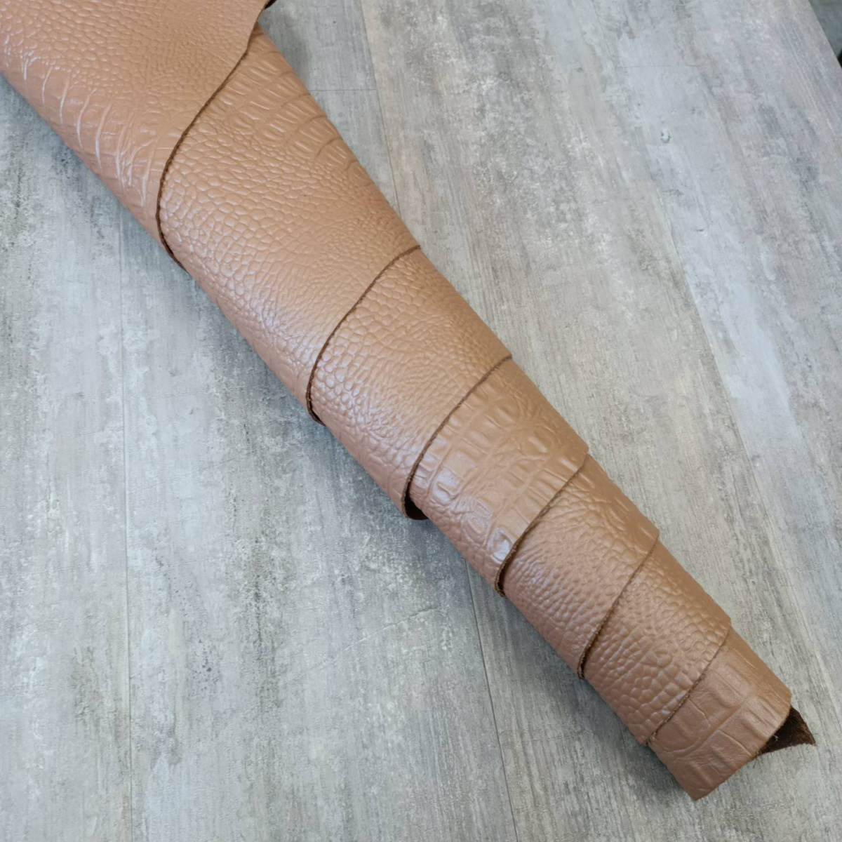 Кожа натуральная КРС хромового дубления с тиснением под каймана. Кожа тонкая, мягкая, тянется. Лицо гладкое, с плотной закраской, красивый градиентный цвет и узор.