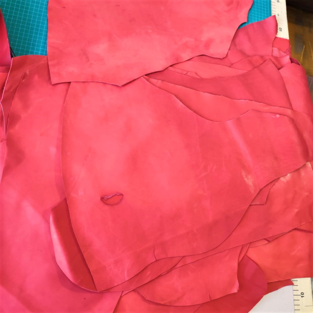 Краст красный, толщина 1,0-1,3, мягкий, пластичный, разбит в барабане. Лицо с ярко выраженной мереей, с бахтармы ворс не высокий. Лицевая сторона крастов может иметь некоторые следы от царапин, растяжек и прочие натуральные дефекты, характерные и естественные для данной выделки). Отлично подойдет для пошива сумок, рюкзаков, для подклада в двухслойных ремнях. Для кошельков слишком мягкий.