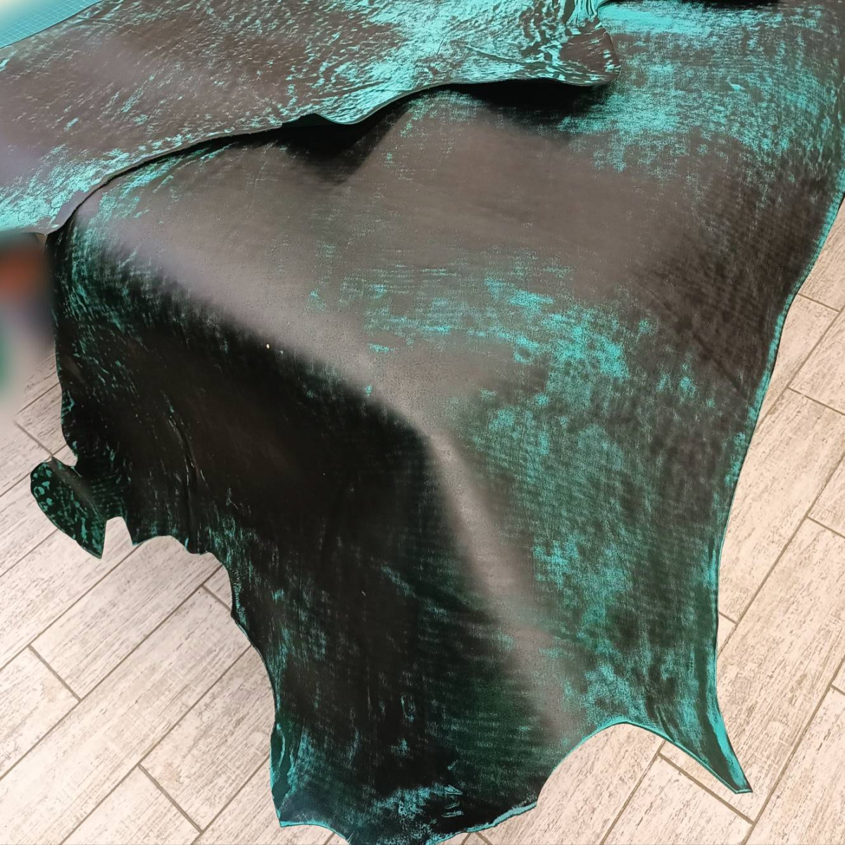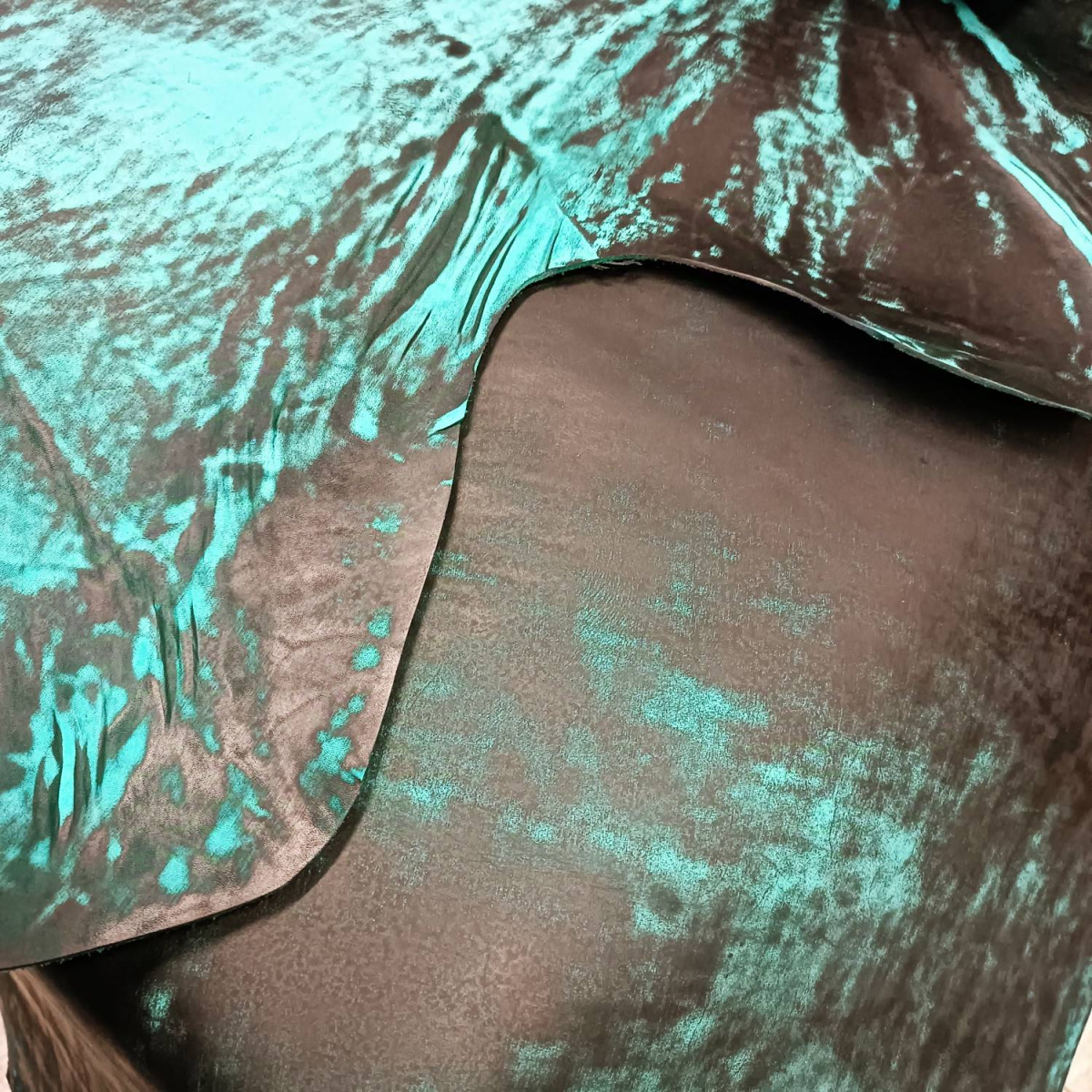 Кожа за счет особенностей обработки лицевой поверхности имеет оригинальный неповторимый узор. Сквозь Черный лицевой окрас поглядывает бирюзовая сквозная тонировка.
