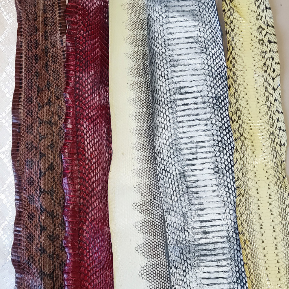 Змеиную кожу используют в качестве декоративных элементов при пошиве галантерейных изделий, а также как самостоятельный материал при изготовлении украшений, колье, браслетов, часовых ремешков, чехлов для телефона и других кожаных аксессуаров.