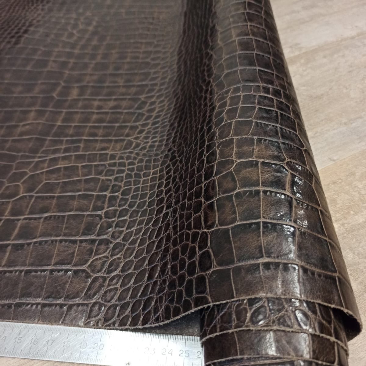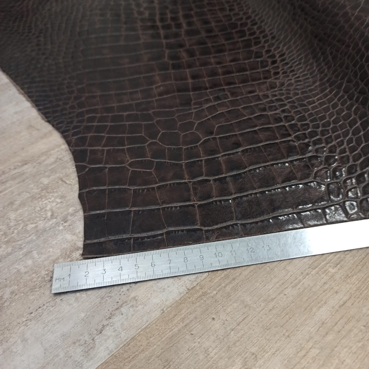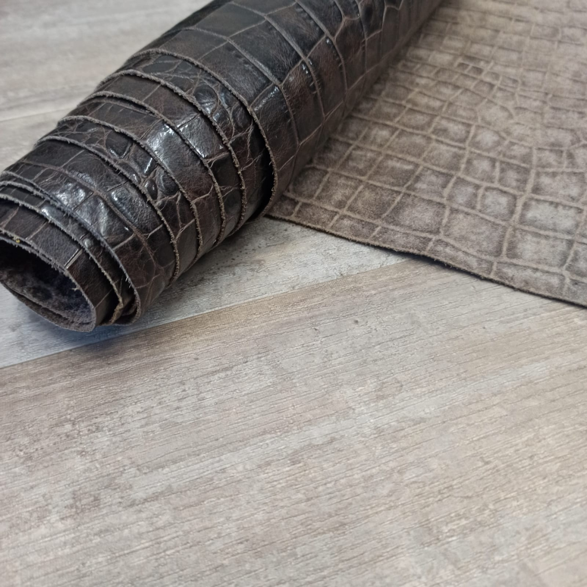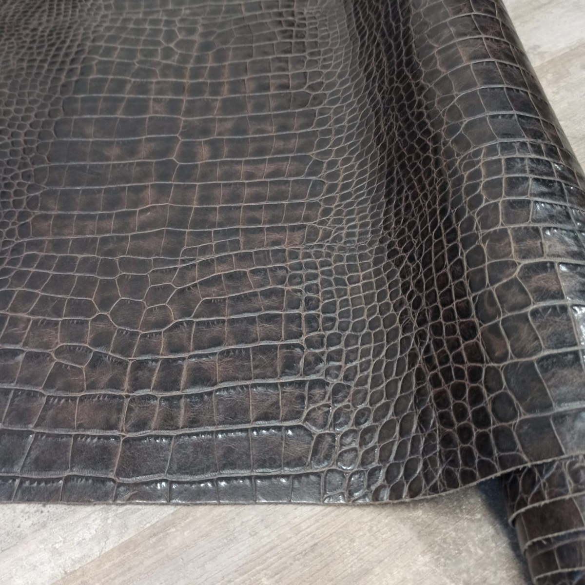 Кожа КРС хромового дубления с тиснением плитой под каймана. Кожа тонкая, плотная. Лицо гладкое, матовое, оригинальный цвет и узор.