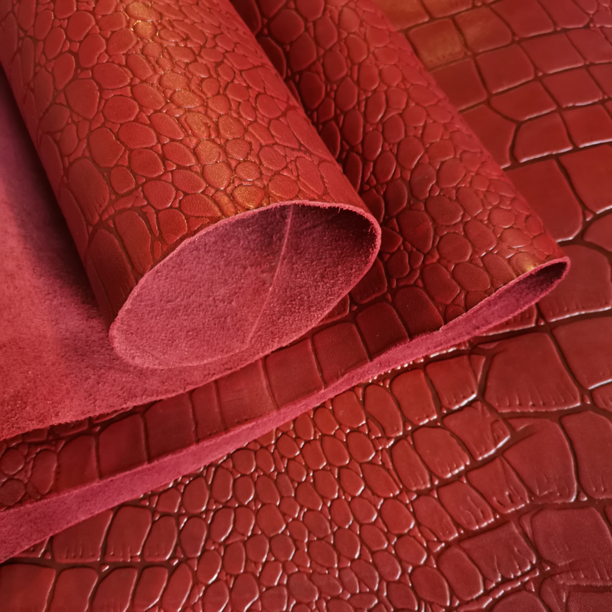 Кожа КРС комбинированного (растительнохромсинтанного) дубления с тиснением плитой "Камни". Кожа тонкая, плотная. Лицо гладкое, матовое, насыщенный красивый цвет и оригинальный узор. Тиснение ярко выраженное, глубокое, рисунок узора крупный.
