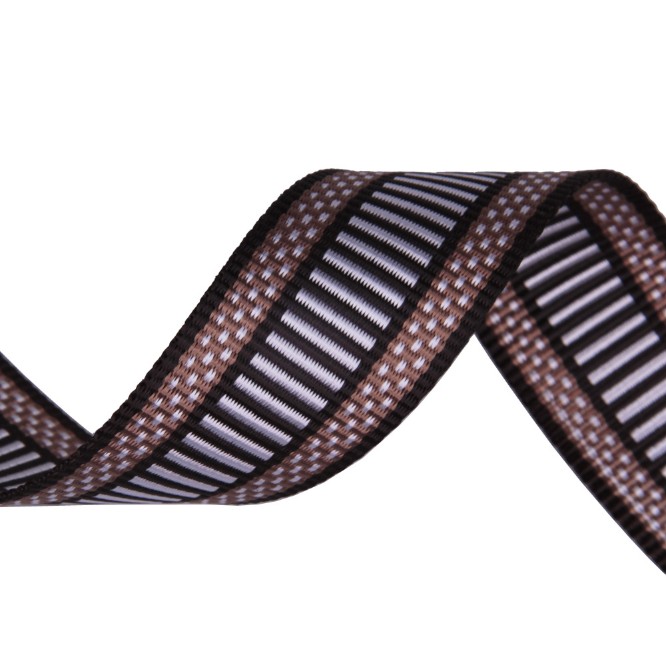 Плотная ременная лента из полиэстера с интересным плетением, коричневая с белыми и темно-коричневыми геометрическим орнаментом.