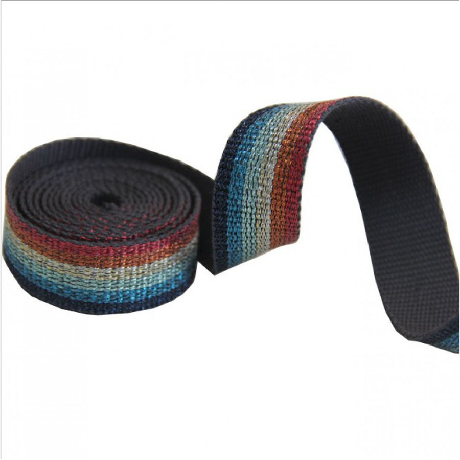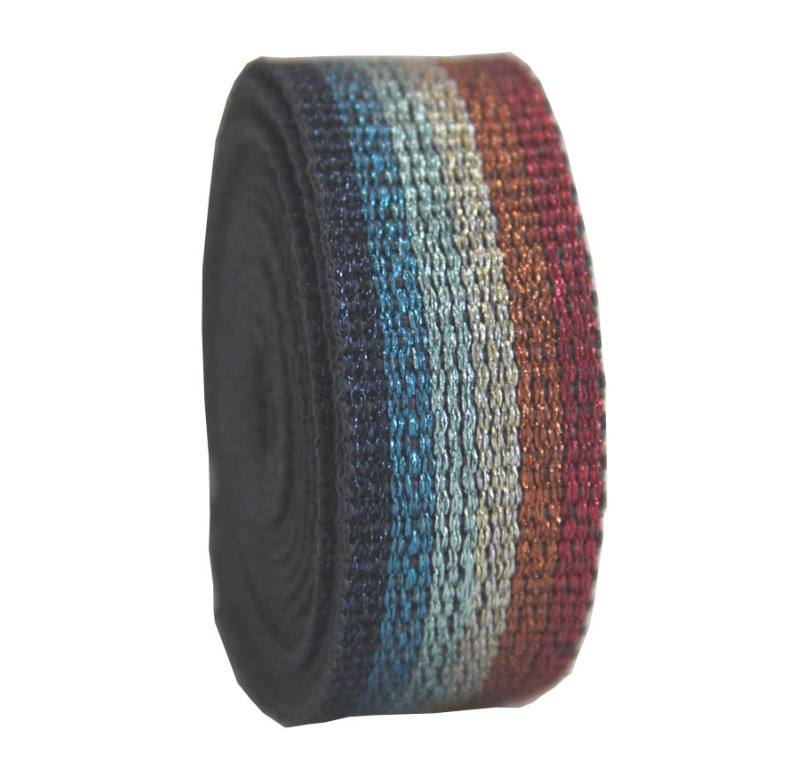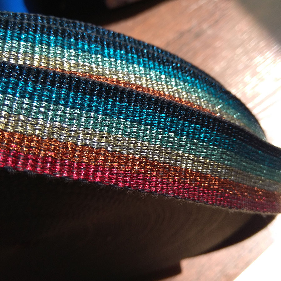 Плотная ременная лента с разноцветными полосками с люрексом (мягкий ненавязчивый, но нарядный блеск). Лента-стропа с изнаночной стороны имеет однотонную гладкую поверхность.