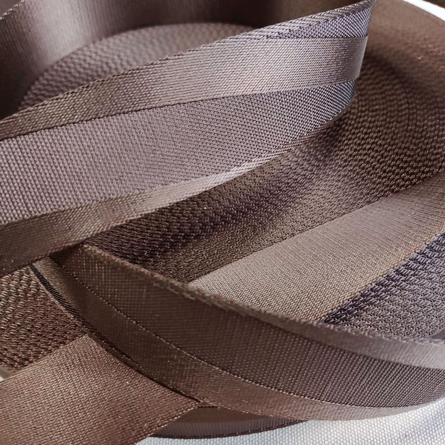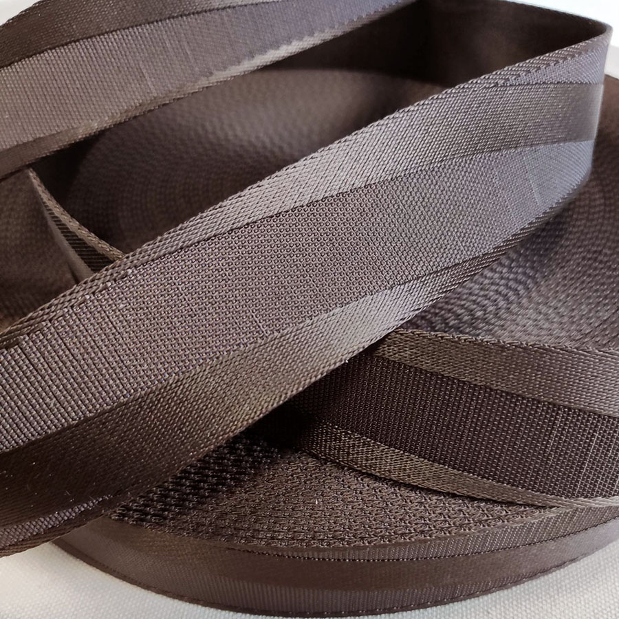 Плотная ременная текстильная лента из полиэстера коричневого цвета с интересным рельефом в виде полосы, пересекающей ленту