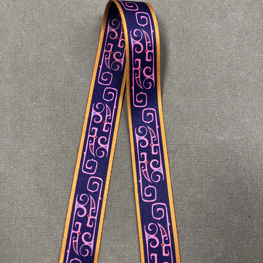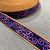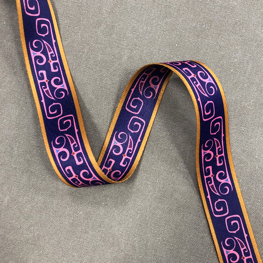 Плотная ременная лента из синтетических волокон. Текстильная тесьма с ярким принтом в виде этнического узора в малиново-фиолетовой цветовой гамме с яркой золотистой полосой по канту.