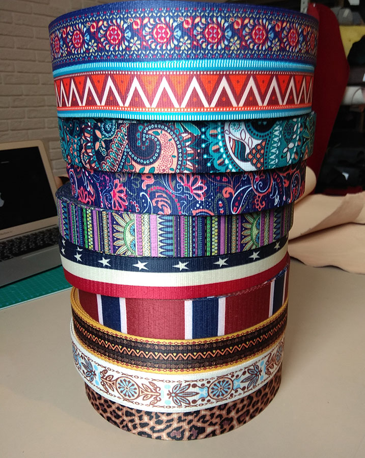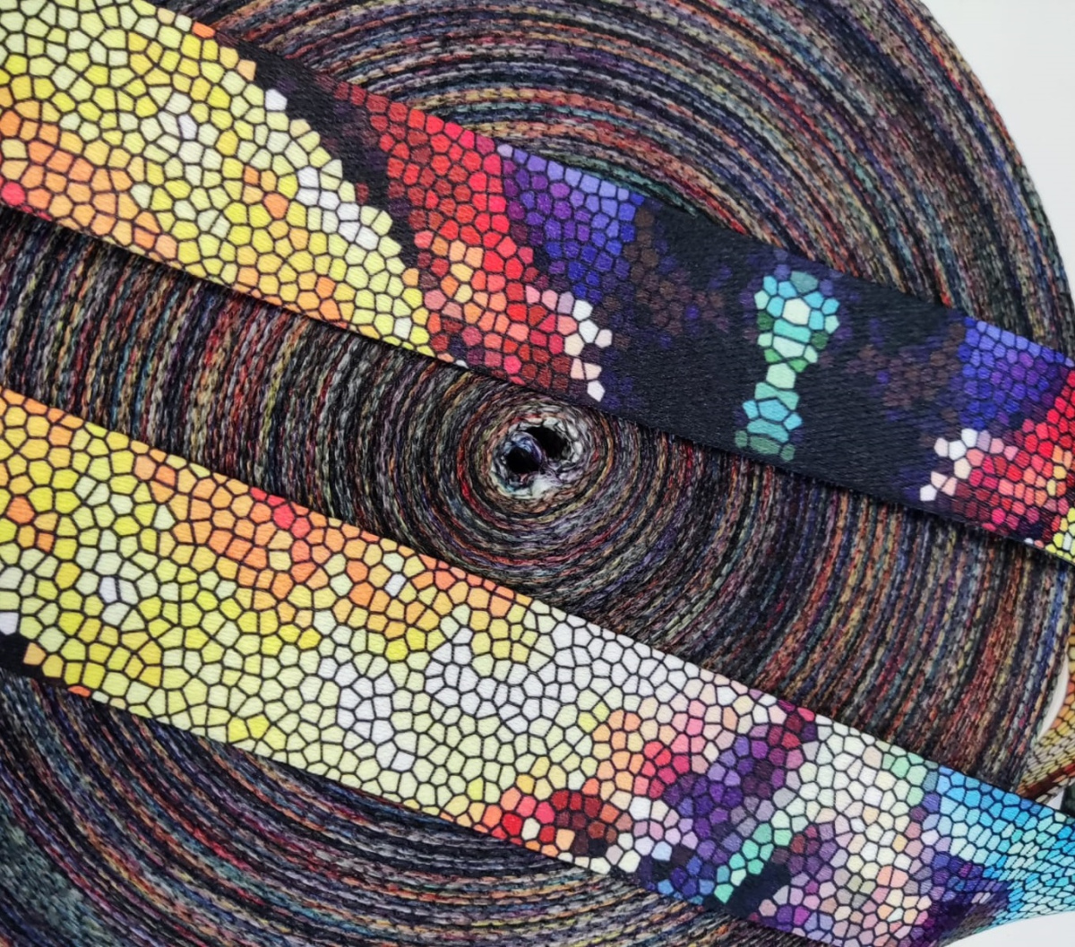 Стропа (ременная лента) плотная из синтетических волокон с интересным универсальным по цветам принтом, благодаря широкой цветовой палитре рисунка текстильная лента будет гармонировать с изделиями самых разных цветов