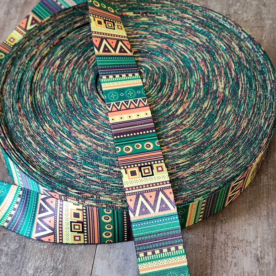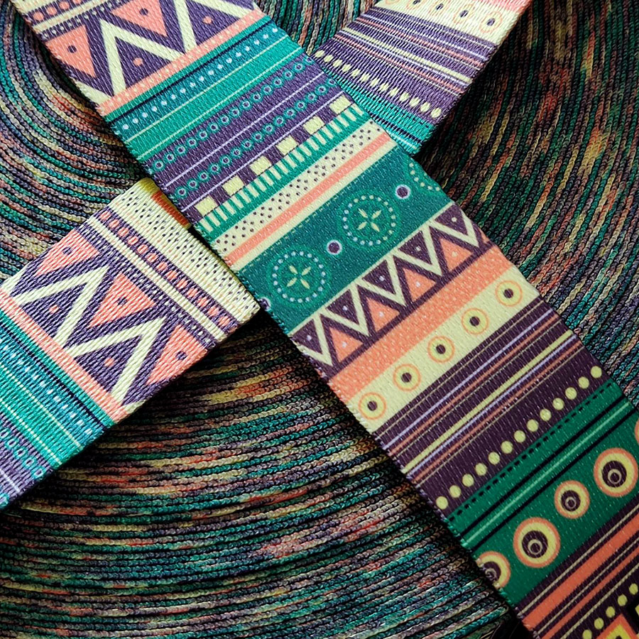 Стропа (ременная лента) средней плотности из синтетических волокон - с геометрическим орнаментом в пестрой гамме. Оригинальное цветовое сочетание принта текстильной стропы с ярким рисунком украсит ваше изделие.