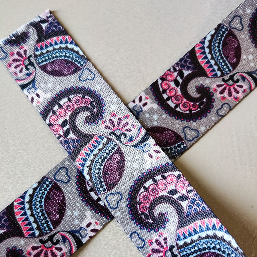 Стропа (ременная лента) средней плотности из синтетических волокон - с традиционным восточным рисунком пейсли (огурцы), в бежево-бордовой гамме. Оригинальное цветовое сочетание текстильной стропы с ярким принтом украсит ваше изделие.