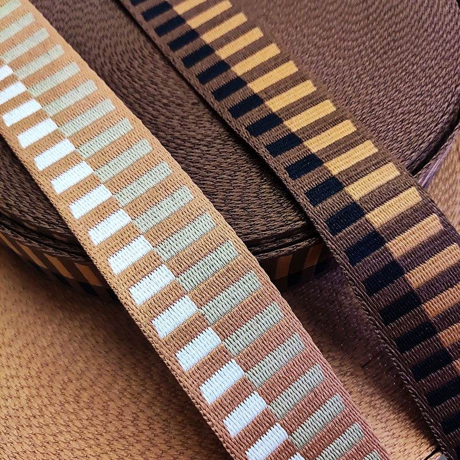 Плотная ременная лента из синтетических волокон с геометричным рисунком. Оригинальное цветовое сочетание ленты украсит ваше изделие.