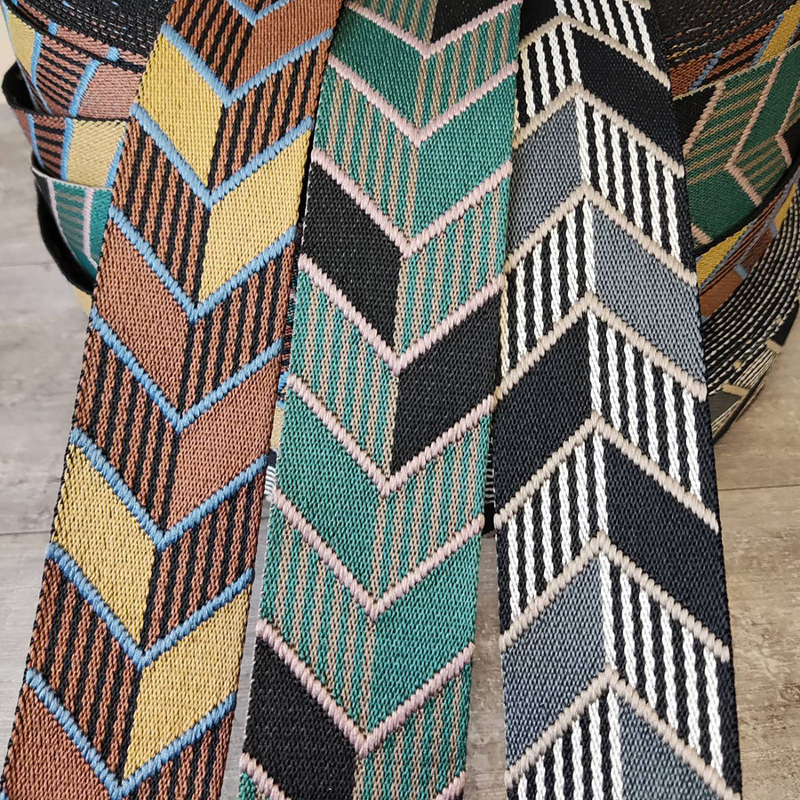 Стропа (ременная /ранцевая лента) из синтетических волокон - плотная, с жаккардовым переплетением в виде протектора автомобильной шины в различных цветовых гаммах. Данная ременная тесьма на обратной стороне имеет другой рисунок