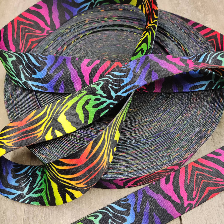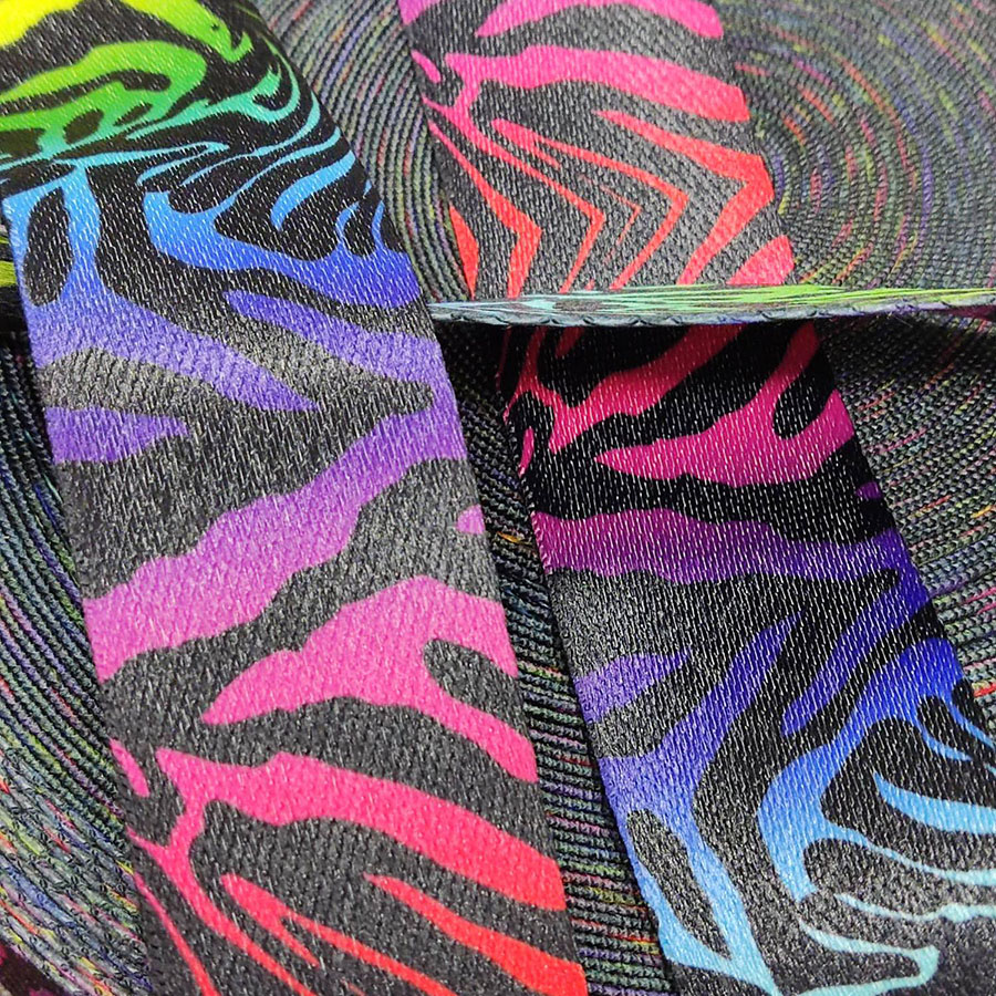 Плотная ременная лента из синтетических волокон.  Орнамент под зебру на радужном фоне.  Оригинальное цветовое сочетание ленты украсит ваше изделие.