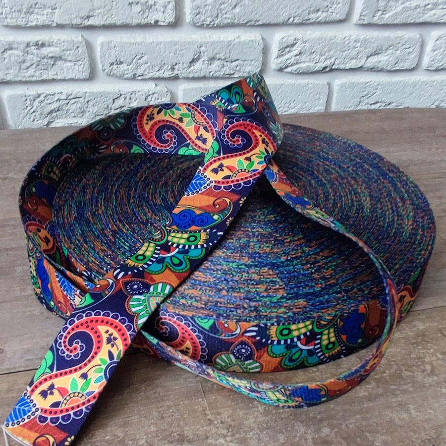 Плотная ременная лента из синтетических волокон.  Пестрый пейсли орнамент на темно-синем фоне.  Оригинальное цветовое сочетание ленты украсит ваше изделие.