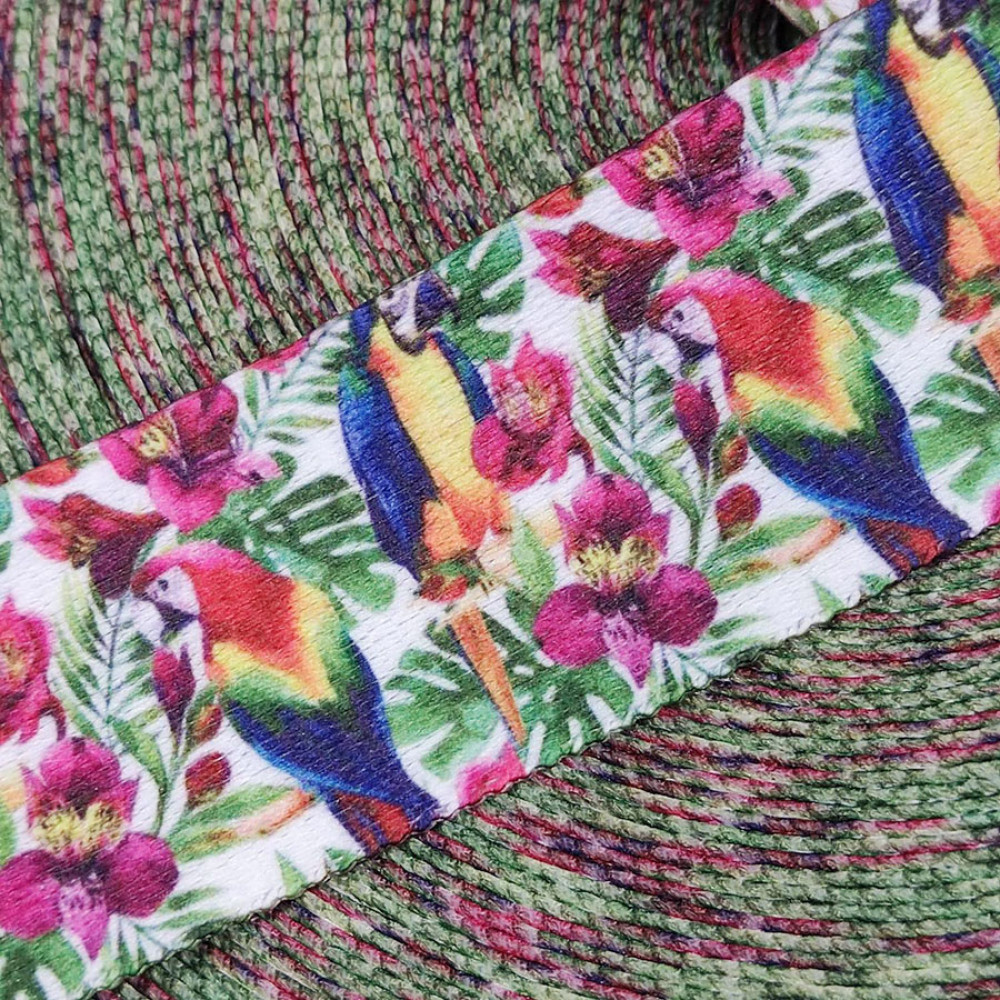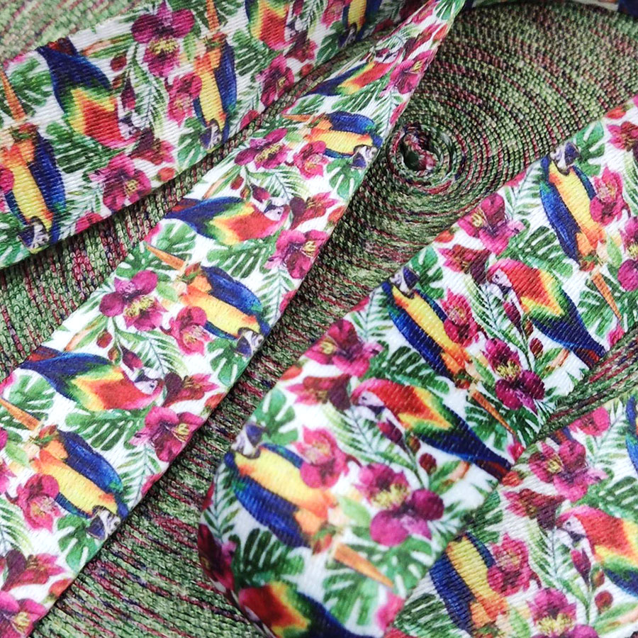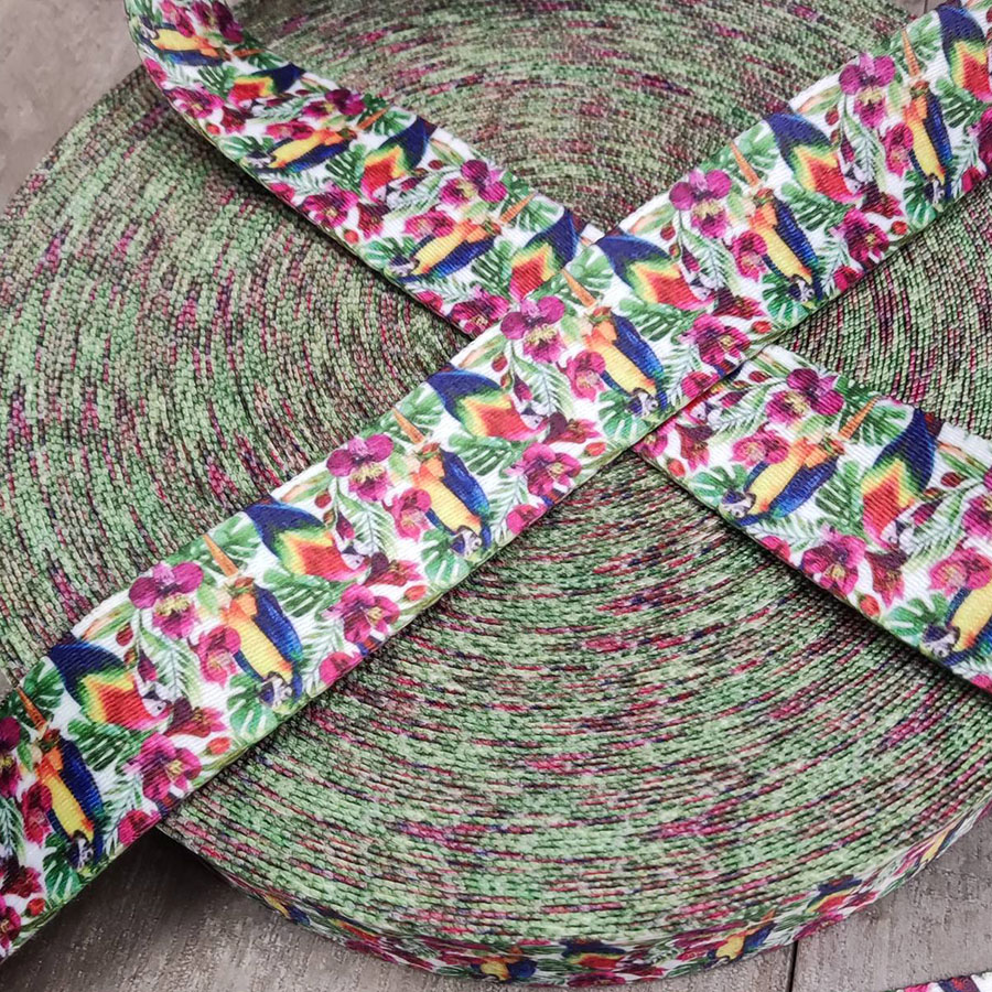 Плотная ременная лента из синтетических волокон.  Орнамент с попугаями, сидящими на ветках с цветами.  Оригинальное цветовое сочетание ленты украсит ваше изделие.