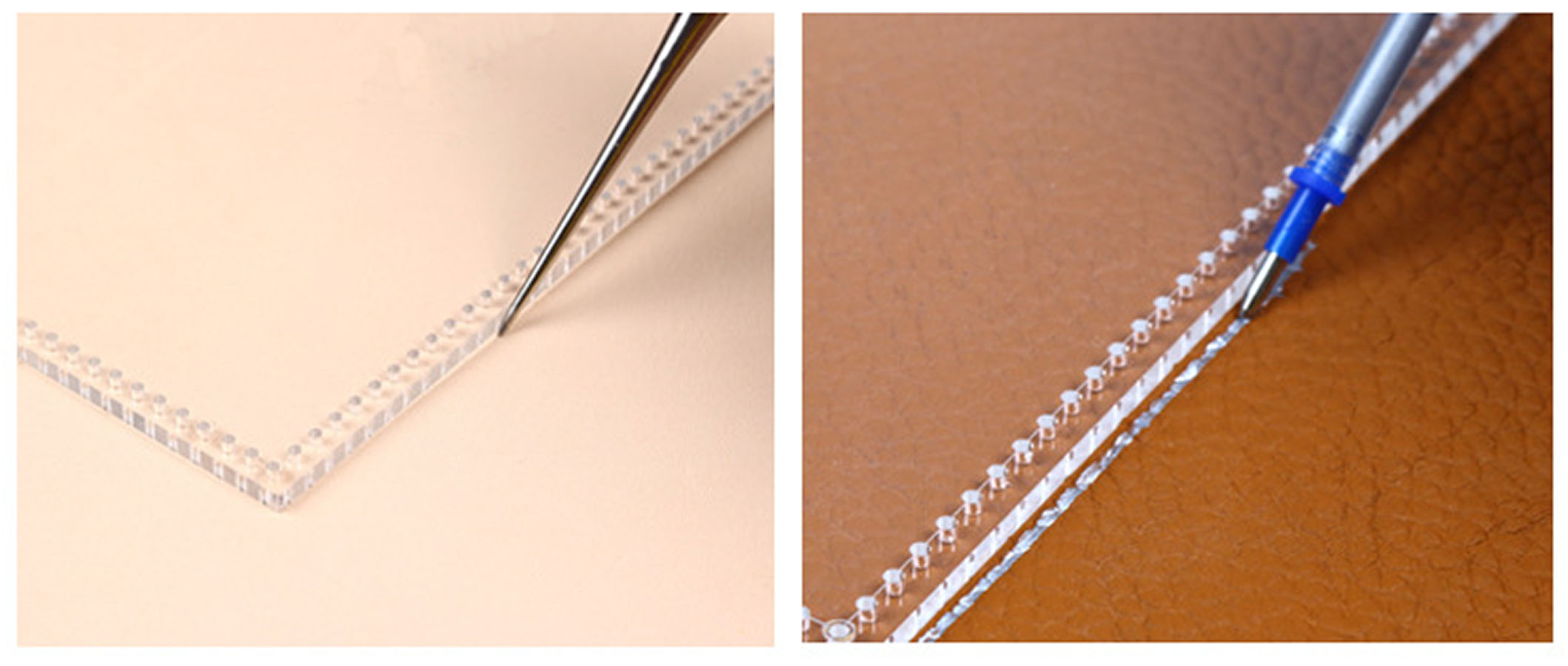 Шаблон для кожгалантерейных изделий имеет специальные отверстия для ровного шва под пробойник с шагом 4 мм